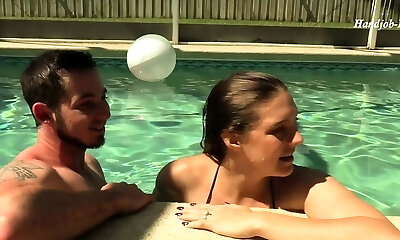 Petite light-haired Bonnie Dolce and Josh have joy outdoors in a small pool.