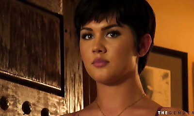 Short-haired TS Daisy Taylor rides gigantic cock in reverse cowgirl stance