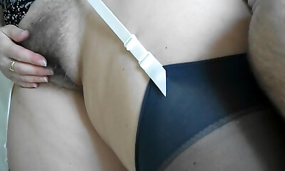 Active Mature BBW in mini mini-skirt rips her pantyhose and spreads