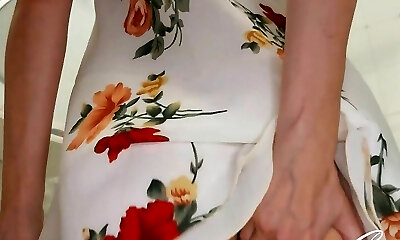 Comfy dress and NO panties, but pubic hair. Thick forest.