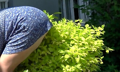 Sexy MILF in dress and black pantyhose shamelessly pissing outdoors
